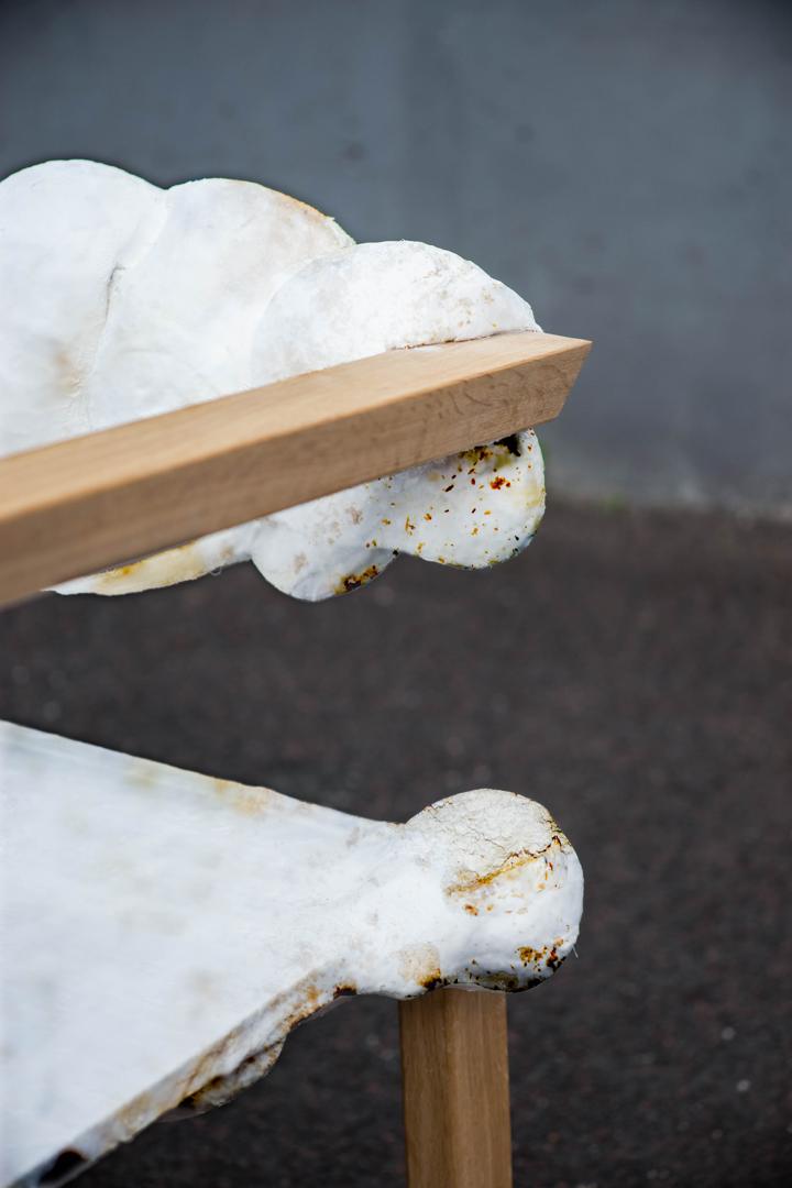 An oak wood construction gives the chair its integral strength, while the backrest consists of mycelium, which is grown into an organic shape to comfort the user.